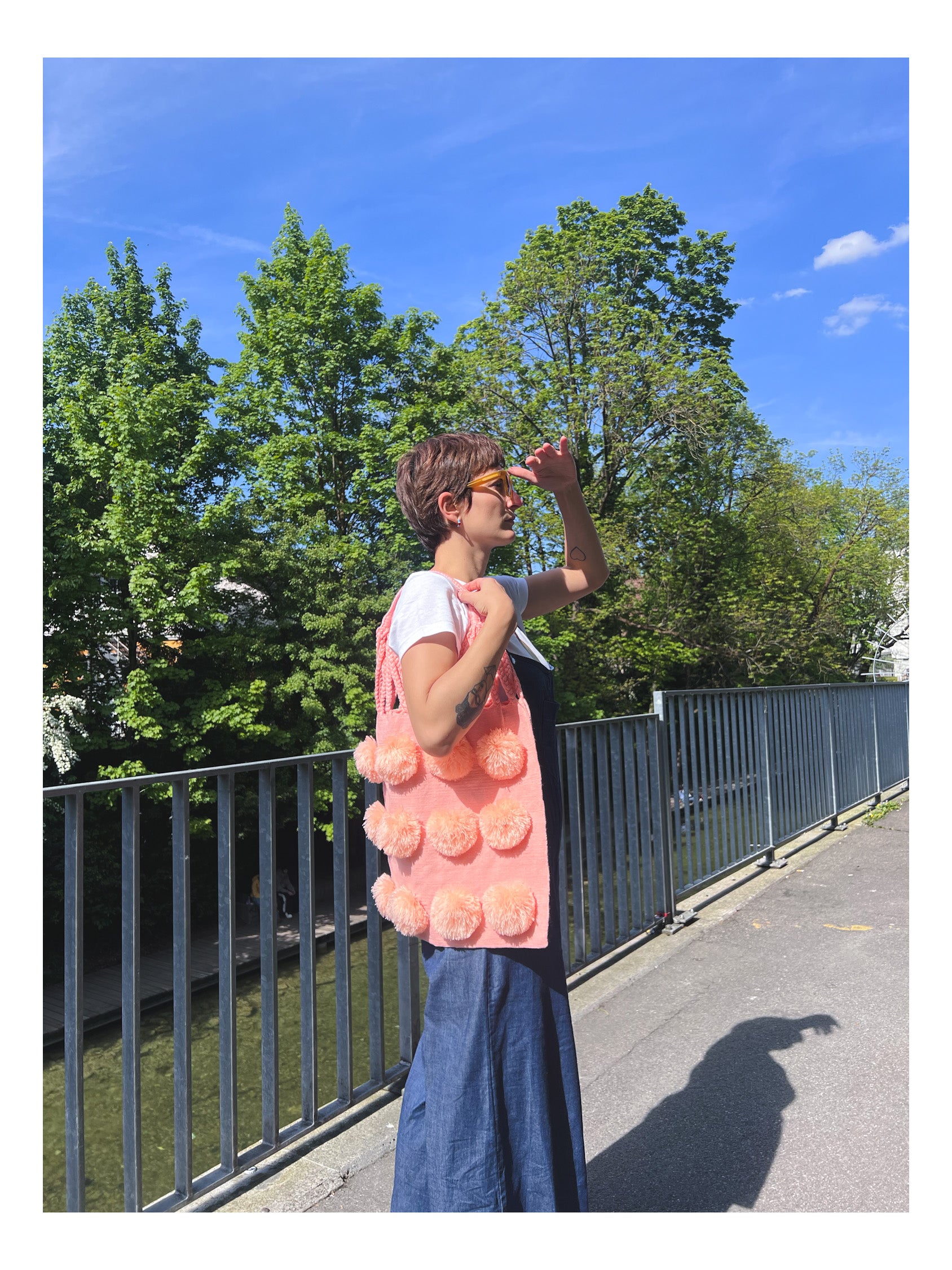 Bolsa de tela rosa con pompón